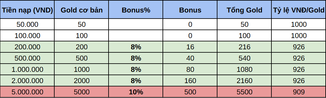 🌟 Đặc biệt: Nạp mệnh giá càng cao, sẽ được thưởng GOLD khuyến mãi càng lớn (từ 8-10% tổng số GOLD nạp) - ÁP DỤNG VỚI 3 KÊNH NẠP, chi tiết trong bảng dưới đây: