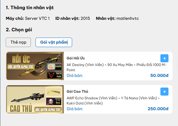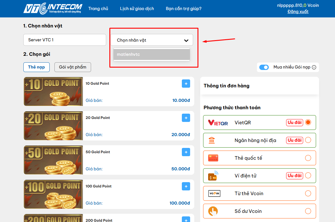 Bước 3: Sau khi đăng nhập thành công, chọn nhân vật và lựa chọn mệnh giá để nạp số GOLD mong muốn