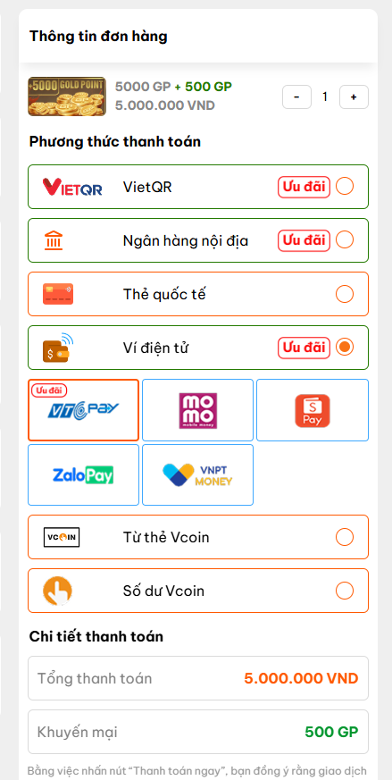 - Lựa chọn gói Gold nạp và số dư Vcoin trong ví sẽ được quy đổi với mức 1 Vcoin = 1 GOLD