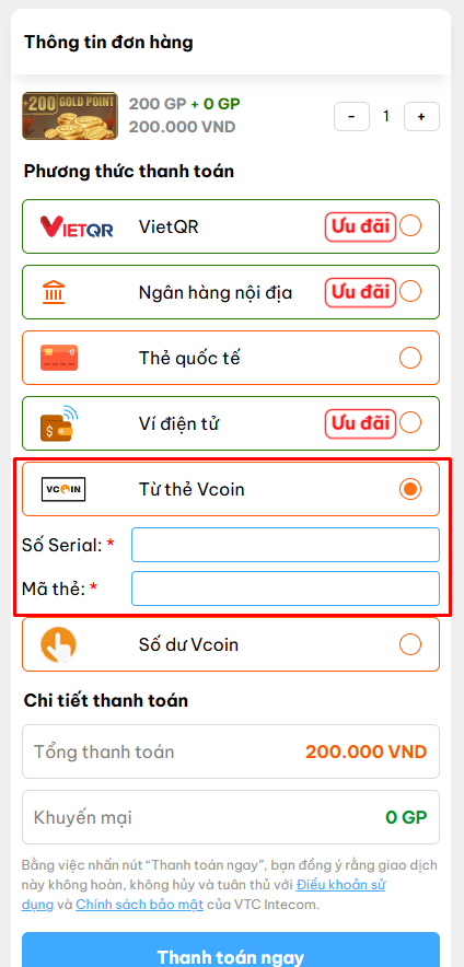- Nạp bằng thẻ cào Vcoin, lựa chọn gói Gold nạp và bạn điền số Serial và Mã Thẻ vào chỗ trống