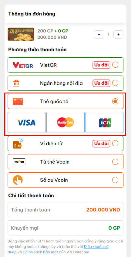 - Khuyến mại lên tới 10% tổng giá trị GOLD nạp đối với 3 kênh nạp và từ mức giá 200.000 VNĐ