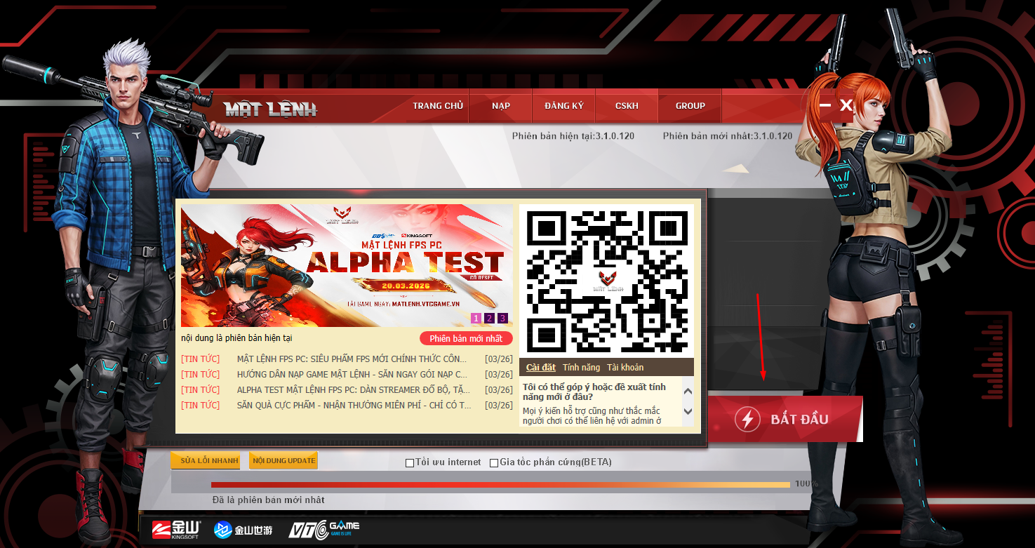 Bước 4: Quá trình Tải và Cài đặt game đã hoàn tất, giao diện Launcher game sẽ hiển thị tương ứng như bên dưới. Người chơi cần click nút Bắt đầu để khám phá đấu trường FPS sống động nhất mùa hè 2026 cùng với Mật Lệnh FPS PC nhé!